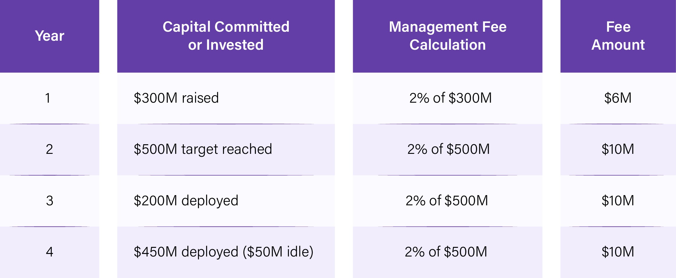 Year 6-10 (Invested basis): Suppose $80M is invested by year 6, the fee is calculated as follows; 2% of $80M = $1.6M per year. As capital is realized or NAV fluctuates, fees adjust accordingly.